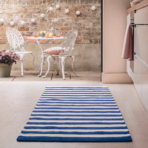 Beautiful finish - A modern blue and white striped rug, in colours handpicked by interior designers