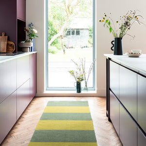 Our online carpets come in five sizes - the small green and grey striped rugs are good for kid's rooms. Green kitchen rug runners work finish off any side return. And our striped stair runner carpet also works as a hallway runner.