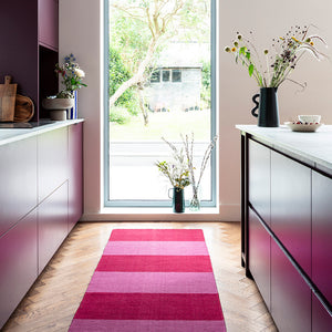 Beautiful finish - A modern pink and red striped rug, in colours handpicked by interior designers